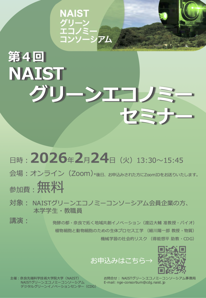 * 講演のアーカイブは、NAISTグリーンエコノミーコンソーシアム会員にYoutubeで公開予定(2026年3月31日まで)